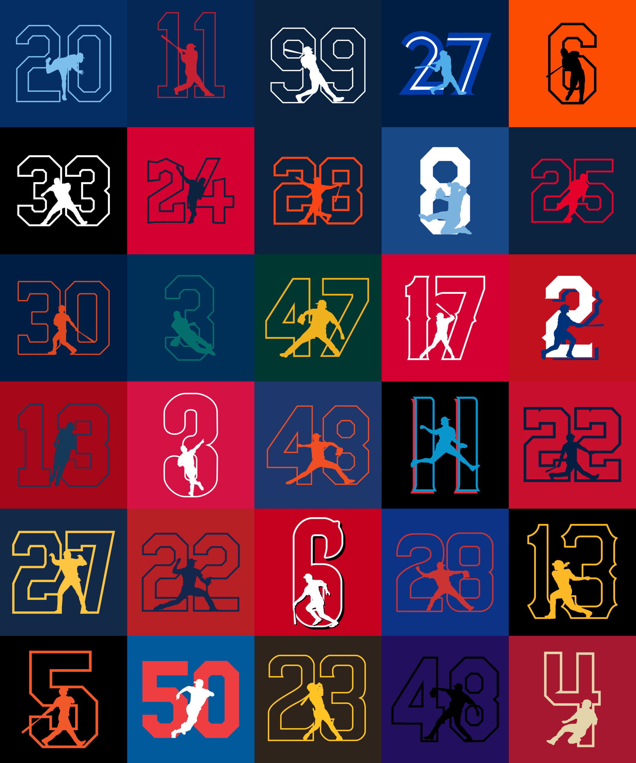 Created vector silhouettes of players based off of action shots and superposed them over their numbers, using team colors to create a composition.
